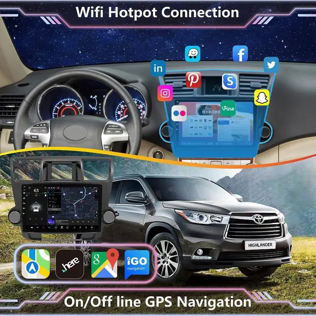 4+128 GB High Performance Android 14 Toyota Highlander Radio Upgrade your Toyota Highlander (2008 2009 2010 2011 2012 2013 ) with this 10.2 -inch Android car stereo. Featuring 4GB RAM and 128GB ROM, it delivers fast performance and smooth operation for apps, music, and navigation, ensuring a preriving experience.: ^^ Wireless CarPlay & Android Auto for Seamless ConnectivityThis Toyota Highlander radio supports Carplay and Android Auto via USB cable or Bluetooth. Enjoy hands-free convenience with Wireless CarPlay and Android Auto. Connect via Bluetooth or USB to access calls, messages, music, and navigation using Siri or Google Assistant. Mirror your phone screen for easy control while driving. ^^ Built-in GPS & Wi-Fi for Smart NavigationNever lose your way with built-in GPS navigation, this Toyota Highlander stereo supports both online and offline maps. Connect to Wi-Fi to download free offline maps or stream music and videos. Download popular apps like Waze, Spotify, and more from the Google Play Store. ^^ Steering Wheel Control & Backup Camera for Safer Driving Stay focused on the road with steering wheel control, allowing you to manage the stereo without distractions. The Highlander stereo package included backup camera provides a clear rear view, reducing blind spots and making parking easier and safer. ^^ Bluetooth Hands-Free Calling & FM Radio Make crystal-clear hands-free calls and stream music via Bluetooth. The built-in FM radio with 18 preset stations keeps you updated with news, music, weather, and traffic information, enhancing your driving experience.