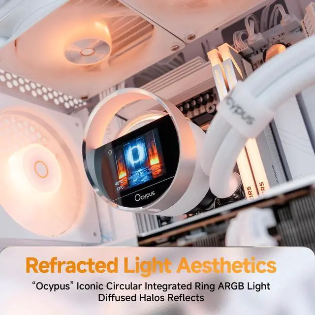 Refracted Light AestheticsDesign Futuristic Form. Crafted from aerospace-grade aluminum, the iconic circular form blends brand heritage with futuristic elegance, featuring customizable ARGB lighting effects, delivering a smooth and dynamic aesthetic. ^^ Fresh Look on AIO Paired with the all-new Ocypus Display, 2.4 inch IPS screen, 320 240 Resolution, reinvent the digital display experience, customize display at will, express your unique style without limits. ^^ Ocypus Display SoftwareThe "Ocypus Display" must be downloaded from the official Ocypus website. It supports Windows 10 / Windows 11 and requires connection via USB 2.0 port.