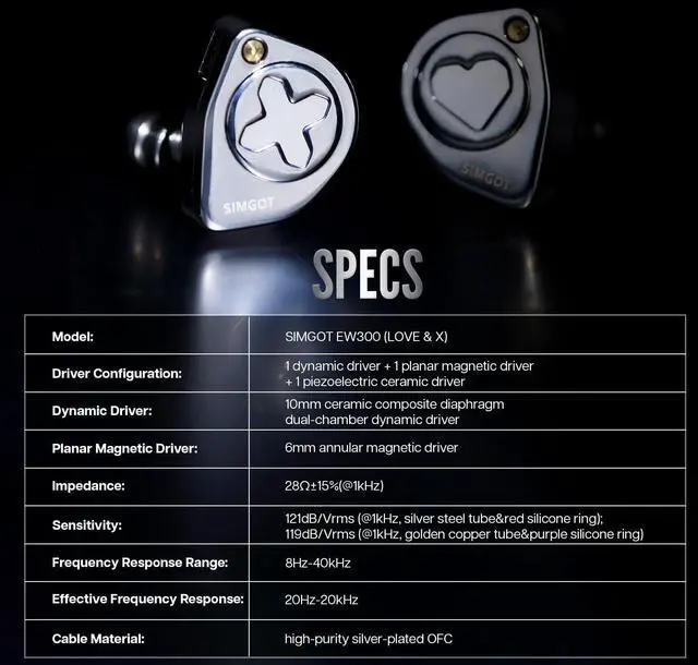 : Introducing the EW300HBB Limited Edition, a unique collaboration with renowned YouTuber Hawaii Bad Boy (HBB) of BadGuyGoodAudioReviews. This version sports a sleek matte black shell while preserving the same precise tuning as the standard EW300 model. It also features custom packaging and a distinctive HBB laser engraving, making it a prized item for fans and audiophiles alike ^^ ++: The SIMGOT EW300 features a premium setup with 1 dynamic driver, 1 planar driver, and 1 piezoelectric ceramic driver on each side. Balancing the acoustic characteristics across these drivers required careful consideration. After extensive material adjustments and acoustic testing, a tri-matrix acoustic architecture was crafted ^^,: The EW300 offers a replaceable nozzle design, featuring two distinct tuning styles. Each set of nozzles is equipped with unique tuning systems and techniques. The innovative threaded connection enables quick and easy nozzle swaps, allowing users to effortlessly switch between different music styles. The EW300 provides two premium tuning choices based on the SIMGOT-Golden2023 and