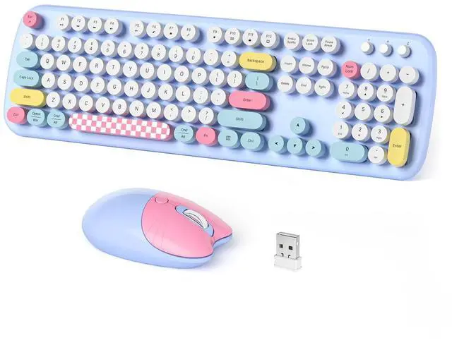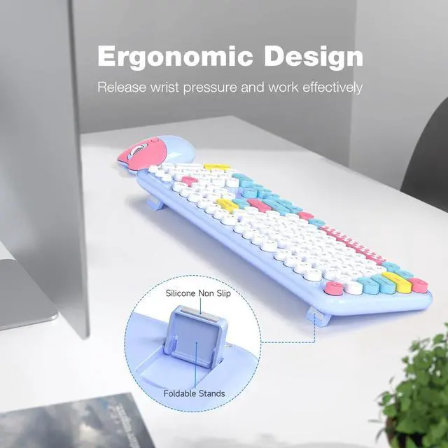 Cute Wireless KeyboardThe inspiration for these cute rounded keys comes from vintage typewriters offering you visual enjoyment and a retro feeling to type. With colorful key caps, make you be distinctive in the office and work full of fun. ^^ 2.4G Wireless Plug and Play Simply connect both your portable keyboard and mouse with one USB receiver without any software, and then enjoy a strong and reliable wireless connection virtually no delays or dropouts. ^^ Upgrading TechnologyThe keycaps are made of ABS environment-friendly plastic characterized by ergonomic design and a comfortable feel. And there is a foldable stand on the back of the keyboard to reduce hand fatigue, hence enhancing your typing experience.