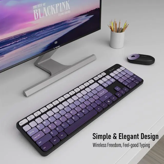 Wireless Keyboard and Mouse Bundle Fashion & Colorful Rechargeable wireless keyboard and mouse combo set with full-sized 104 keys keyboard and colorful compact design. Keyboard with full-size keys, arrow keys, number pad, and shortcuts; Ambidextrous mouse is comfortable for both left and right handed users and compatible with 800/1200/1600 DPI levels;