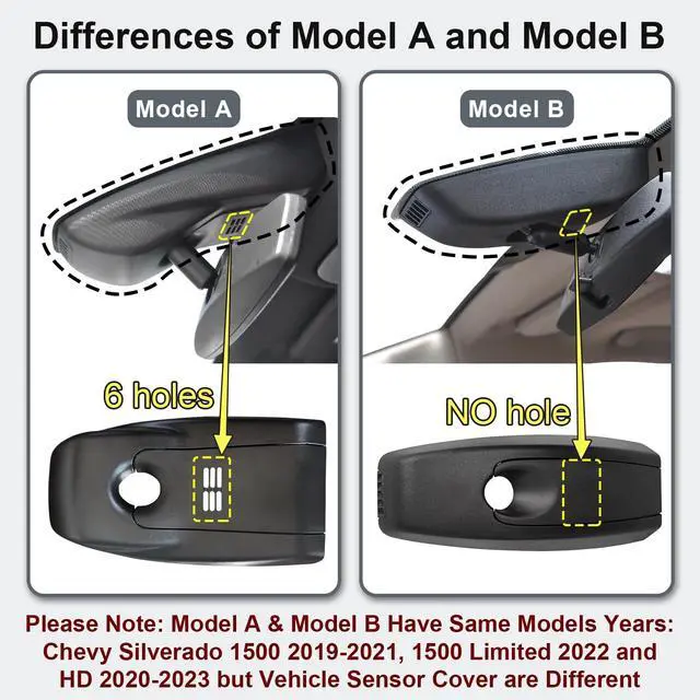 Custom fit for Chevrolet Silverado 1500Mangoal Front 4K and Rear 1080P dash cam can fit perfectly behind the rear view mirror like original. Perfectly intergrated with Chevrolet Silverado 1500 2019-2021, 1500 LimitedLTD) 2022 and HD 2020-2023 Vehicle styles (Model B), Such as Work Truck, Costom, LT, 1LT, 2LT, Custom Trail Boss, RST, LTZ, LT Trail Boss, High Country ^^ Please NoteModel A & Model B Have Same Models Years: Chevy Silverado 1500 2019-2021, 1500 Limited 2022 and HD 2020-2023 but Vehicle Sensor Cover are Different, Please carefully look at 2nd and 3rd pictures, which are model comparison pictures ^^ Silverado Model EModle E is only suitable for vehicle styles With AUTO DIMMING function and NO the SENSOR COVER, The asin corresponding to Modle E is B0D2NPHDNQ and B0D2NVTT98 ^^ Please NoteYour car must have an Auto-Dimming Rearview Mirror Plug Power Adapter (10Pin square plug), otherwise, power can only be obtained through OBD or Fuse box. Parking monitor must have OBD Power Adapter or Fuse Box