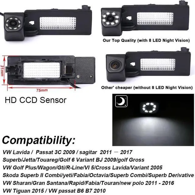 Dear customer, Please must check the camera size and appearance before place a order, see if can fit your car license plate lamp place size and appearance! Because the same car model in different countries may have some difference, please check the camera size and compare the installation of your car carefully to avoid mistake. This product could fit for all below models as expected: Replacement for replacement for VW Lavida/ Passat 3C 2009 / sagitar 2011 - 2017; Superb/Jetta/Touareg/Golf 6 Variant BJ 2009/golf Gross; Replacement for VW Golf Plus/Wagon/Gti/R-Line/Vl 5/Cross Lavida/Variant 2005; Skoda Superb II Combi/yeti/Fabia/Octavia/Superb Combi/Superb Derivative; Sharan/Gran Santana/Rapid/Fabia/new polo 2011.2016; Tiguan 2015 / passat B6 B7 2010-