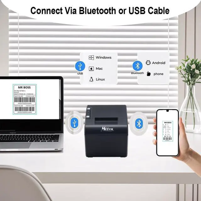 MR.BOSS Thermal Label and Receipt Printer USB+Bluetooth Connection, Supports Label Printing, Suitable for waybills and Receipts in Milk Tea Shops, Coffee Shops, Convenience Stores and Beverage Stores