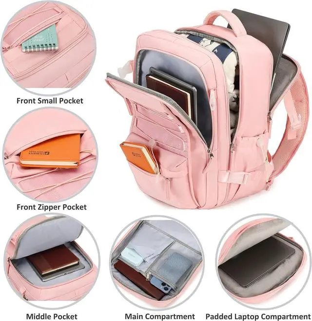 USB Charging Port Design: With built in USB charger outside and built in charging cable inside, this USB knapsacks offers you a more convenient way to charge your phone while walking. Please noted that this daypacks doesn't power charger itself, USB charging port only offers an easy access to charge ^^ Slim Durable Travel Backpack for Women Men This travelling back bag is made of durable waterproof nylon, good air permeability and heat dissipation with two padded shoulder straps, offers lightweight carrying and strength reinforcement, relieve shoulder pressure, and maintain cool when wearing for a long time. And it's hard, solid, and doesn't fade ^^ Separate Laptop Compartment Design & Practical Pockets: One separated laptop padded compartment holds 15.6 Inch laptops as well as 16 Inch, 15 Inch 14 Inch and 13 Inch. The middle compartment is roomy for daily necessities, clothing, iPad, tech electronics accessories, A4 magazines, etc. The three front compartments make your small items organized and easier to find. Two side drawstring pockets is specifically designed for the water bottler or umbrella to let you use them more convenient ^^ Anti Theft Multifunctional Backpack A luggage strap allows the back pack fit on luggage/suitcase, slide over the luggage upright handle tube for easier carrying. With a hidden anti theft pocket on the back protect your valuable items from thieves. Well made for international airplane travel and day trip as a travel gift for women ^^ External dimensions 17.8 "x 12.8" x 7.1 ", Capacity: 50 liters;