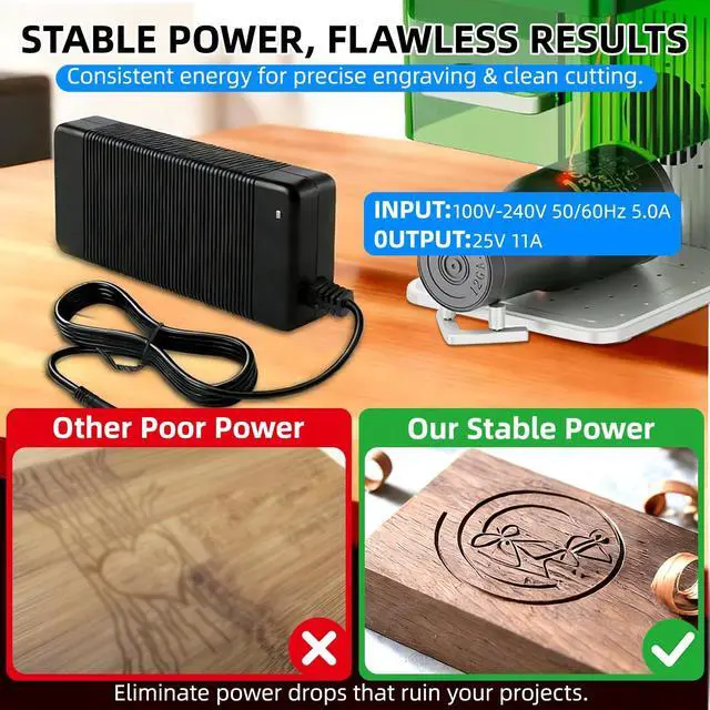 STABLE HIGH POWER OUTPUT: Delivers a consistent power output(25V/11A) to ensure your laser engraver and cutter operates at peak performance. Provides the reliable energy needed for precise engraving and clean cutting across all supported power levels. ^^ 100-240V