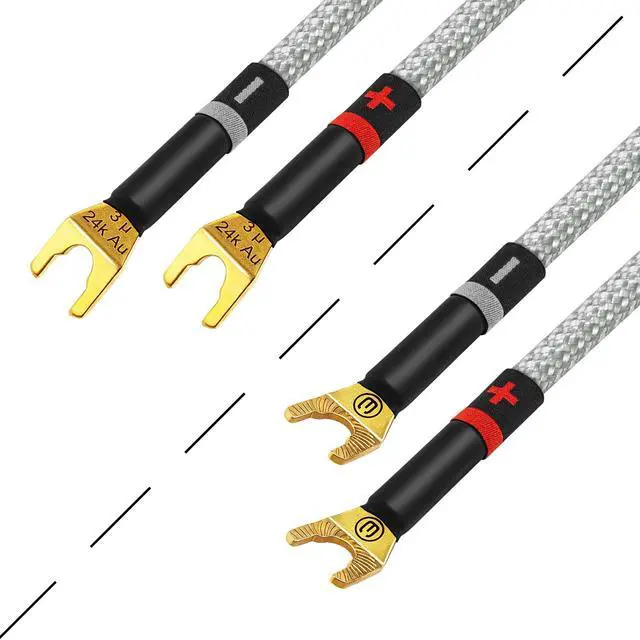 The high-end packaging, makes these a great gift for any Audiophile or Music Lover who will appreciate handcrafted, high-quality audio cabling. The braided Tweed cloth jacket and embroidered labeling will compliment your high-end gear quite tastefully; this is truly The Ultimate speaker cable. ^^ At WBC we only use the highest-grade connectors for these audiophile cable assemblies. Eminence 3 micron, 24K Gold plated, audiophile-grade, multi-spade connectors, (compatible with 8mm and 6mm binding posts), provide superior abrasion & corrosion resistance and unrivaled performance. The spade plugs are specially reinforced to support heavy gauge cables (thicker profile).