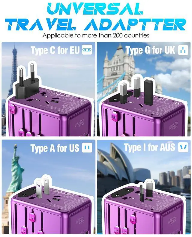 Broad International Support -- URJD international travel adapter includes Type A (US), Type I (AU), Type G (UK), and Type C (EU) plugs, directly support outlets in America, England, Ireland, Europe, Asia Italy, France, China, Korea, Australia, Hong Kong, Paris, Japan, Kenya, Egypt, Morocco, Rwanda, and Brazil, covers over 200 Countries and Regions. Adaptor does NOT work in India (Type D) and South Africa (Type M). ^^ Universal Adapter Charges 6 Devices Simultaneously at Higher Speeds -- This 6 IN 1 international plug adapter comes with More USB output, 3x USB-C Ports( 3.0A )
