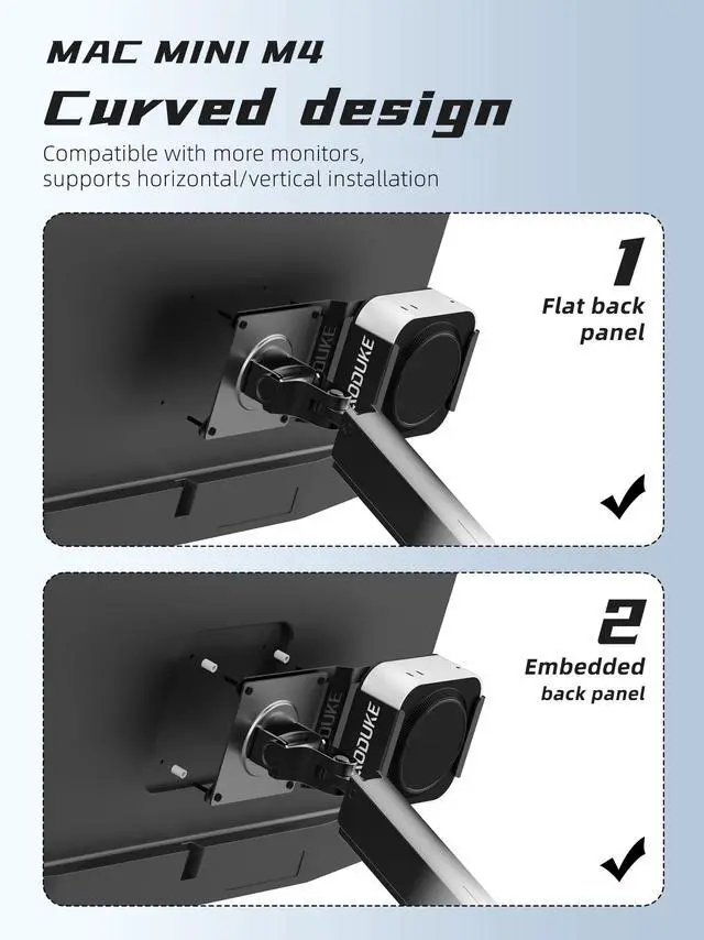 Product Materials: The Mac Mini support section is crafted from full aluminum alloy, while the VESA extension panel is made of galvanized steel for strength, durability, and long-term reliability. ^^