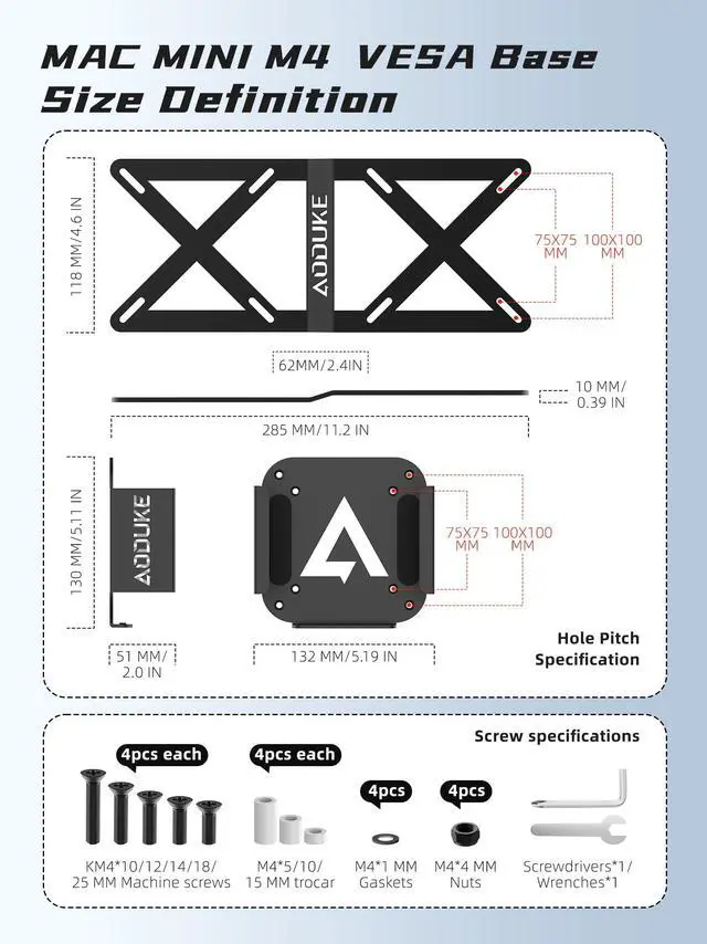 Product Features: This 2024 Mac Mini Stand is ideal for users who have already used a VESA monitor stand, it will be installed between the monitor and the VESA stand monitor, and can extend a VESA panel for Mac Mini installation; (only support 75X75/100X100MM hole spacing VESA monitor) ^^