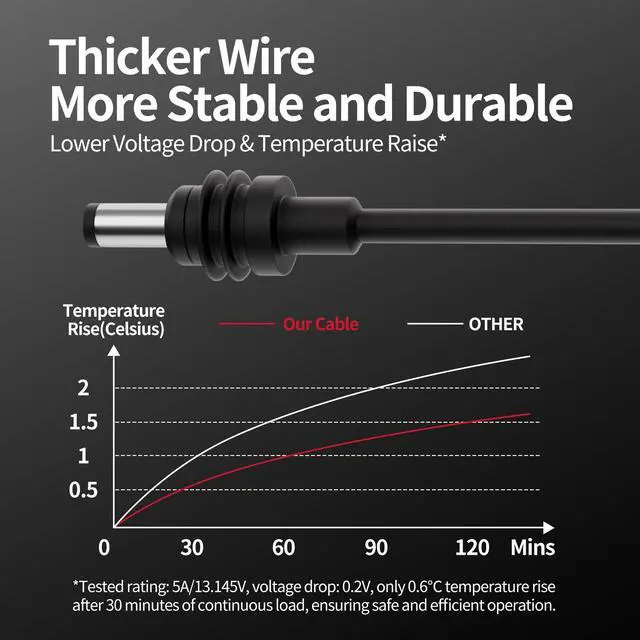 ^^ Efficiency and Reliability: This Starlink Mini DC Power Cable has excellent durability and efficient power capacity. Tested with a 13.145V power supply and 5A load, the voltage drop is only 0.2V. After 30 minutes of continuous load, the temperature rise is minimal at just 0.6C, ensuring safe and efficient operation. ^^ Thicker Wire, More