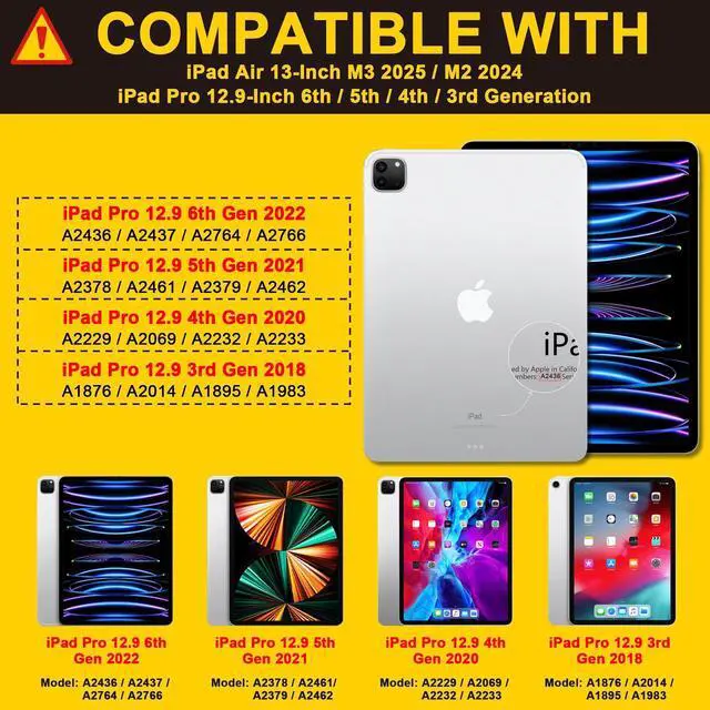 • Compatibility Specially Designed for iPad Pro 12.9 inch 6th Generation 2022 (Model:A2436/A2764/A2437/A2766) & iPad Pro 12.9 inch 5th Generation 2021 (Model:A2378/A2461/A2379/A2462) & iPad Pro 12.9 inch 4th Generation 2020 (Model:A2229/A2069/A2232/A2233) & iPad Pro 12.9 inch 3rd Generation 2018 (Model: A1876/A1895/A1983/A2014). Please Note: Not compatible with any other devices.