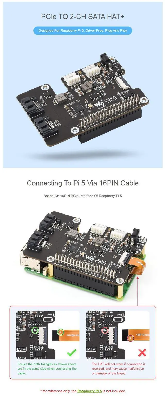 Raspberry Pi 5: This dual-channel PCIe to SATA HAT+ supports SATA 3.0 (6Gbps) for fast and stable HDD/SSD storage, specially designed for Raspberry Pi 5 via 16PIN PCIe interface. ^^ Plug and Play SATA Expansion Board, Driver-Free