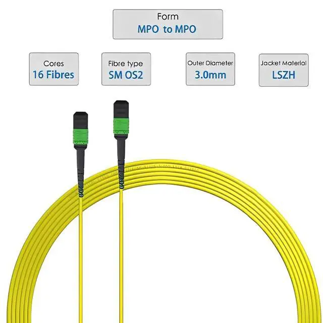 Excellent performance: 16-fibre single-mode fibre 9/125m, type B polarity, jacket material: LSZH, outer diameter: 3.0mm. Low insertion loss (IL 0.35 dB) and high return loss (RL 60 dB) Available for 40G/100G/200G/400G/800G/1.6T optical transceiver modules