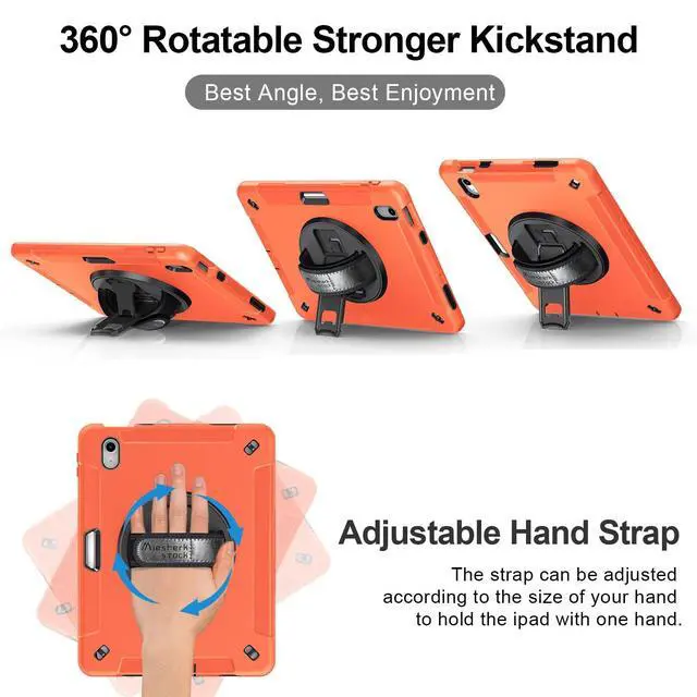 Rotating/Multi-Angle Stand: 360-degree swivel sturdy kickstand that supports multi-angle (Vertical, Horizontal, Halfway between). Case for iPad 10th Generation/11 th Generation can be used to support your iPad while watching a movie, playing games, or typing, let your hands-free. This sturdy kickstand can be folded when you don't need it ^^ Adjustable Hand Strap +