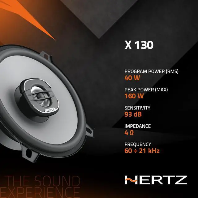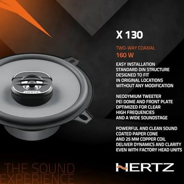 The 5 two way coaxials X 130 features a special designed tweeter faceplate optimized for exceptional off-axis performance to ensure a linear frequency response when installed in a factory replacement setup. The pressed-paper cone treated with water-repellent along with the foam surround provide a very high SPL and extended low frequency response, to obtain a rich sound even when driven by the OEM head unit. The 25 mm (1) woofer voice coil driven by a high-flux density ferrite magnet offers a highly dynamic power handling for a powerful undistorted sound. The easy-to-install DIN size basket, protected by an abrasion-resistant dust paint, makes the factory speakers replacement a snap.