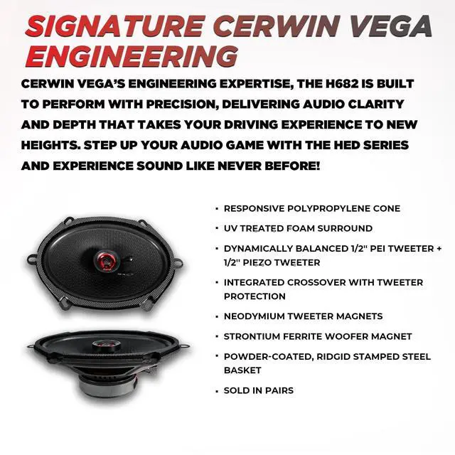 6X8 Woofer & 1 PEI Tweeter A 2-way coaxial system that provides a balanced sound profile with rich bass, clear mids, and sparkling highs. ^^ Dynamically Balanced 1 PEI Tweeter Delivers bright, distortion-free highs with exceptional clarity, elevating the overall listening experience. ^^ Integrated Crossover with Tweeter Protection Smooths transitions between frequencies and protects the tweeter from distortion, even at high volumes. ^^ Sold in Pairs Perfect for those looking to upgrade their sound system with a high-quality coaxial speaker solution. ^^ The H682 offers a premium sound experience in a convenient, integrated design.