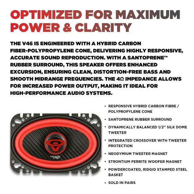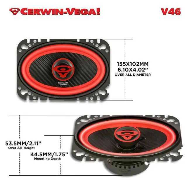 High-PerformanceUnleash the full potential of your sound system with the Cerwin Vega V46, a 4X6" coaxial speaker engineered for precision, power, and durability. As part of the high-performance Vega Series, the V46 delivers crystal-clear highs, rich mids, and deep, punchy bass, ensuring every beat and note is heard with stunning clarity. ^^ 2-Way Coaxial Design with Integrated Crossover & Tweeter ProtectionThe 4X6-inch coaxial speaker features an integrated crossover for seamless frequency balance and includes tweeter protection to prevent distortion, ensuring rich sound at any volume. ^^ Precision Engineering for