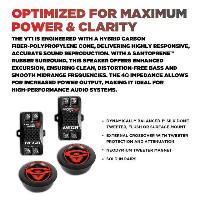 1" Silk Dome Tweeter Delivers crisp, detailed highs with smooth, natural sound reproduction for immersive audio clarity. ^^ Neodymium Magnet Technology Ensures high sensitivity and powerful, distortion-free high-frequency performance. ^^ Dynamically Balanced Design Provides seamless frequency transitions for a well-balanced, full-range sound experience. ^^ Integrated Tweeter Protection Safeguards against distortion and damage, even at high volumes, for reliable performance. ^^ Premium Build Quality Features a rigid stamped steel basket for reduced vibrations and precise sound reproduction.