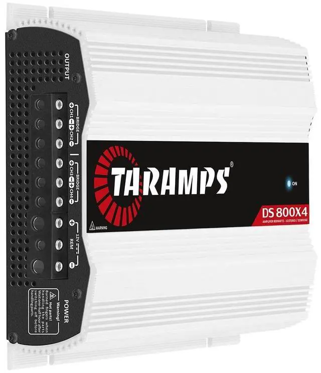 The Taramps DS line has Multichannel amplifiers, which are Full Range amplifiers with 2 or 4 channels, and also features high power and cost-benefit. ^^ The DS 800x4 has 800 Watts RMS at 1 or 2 Ohms. As a versatile multichannel amplifier, this powerful amp offers the flexibility of bridged connections. ^^ This multichannel amplifier features 4 channels with 200 Watts RMS each (800 watts RMS total) and also with high-level input and automatic activation. ^^ The Positive/Negative Power Cable is 7 AWG ^^ The Output Cables Wire Gauge is 15 AWG ^^ The Remote Cable is 18 AWG ^^ The Circuit Breaker or Fuse is 60A.