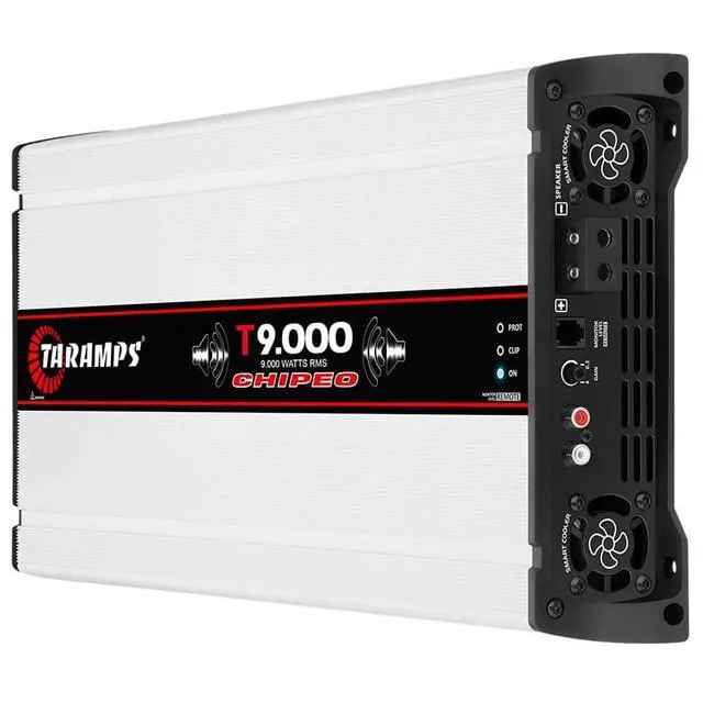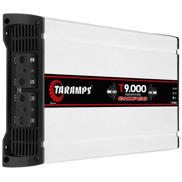 The T Chipeo amplifiers are designed for high frequencies, ideal for subwoofers and woofers. They are mono amplifiers with RCA inputs and are compatible with the Taramps Monitor Level Remote. ^^ The T 9.000 Chipeo delivers 9, 000 Watts RMS at 1 or 2 Ohms, with a peak power of 11, 000 Watts RMS, and operates between 12.6 VDC to 14.4 VDC ^^ The power supply cables are 2x 1/0 AWG, the output cables are 7 AWG, and the remote cable is 18 AWG. We recommend using a 450A circuit breaker or fuse.