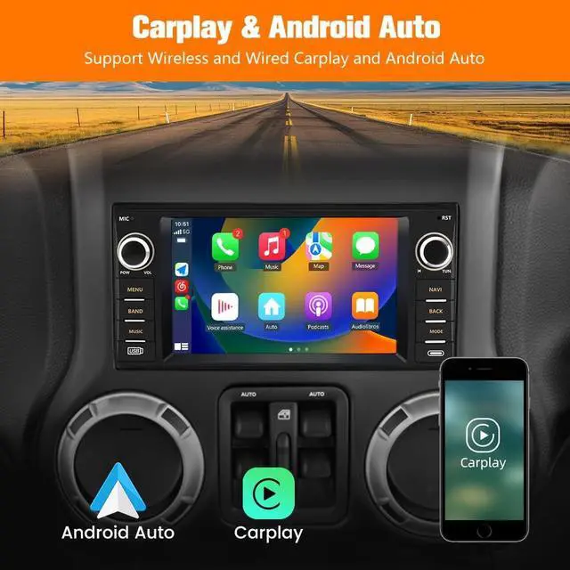Applicable Car ModelsFor Jeep Wrangler/Unlimited 2007-2018; For Jeep Compass 2009-2016; For Jeep Patriot 2009-2016; For Jeep Grand Cherokee 2005-2011; For Jeep Liberty 2008-2011; For Jeep Commander 2008-2011; For Chrysler Sebring 2007-2010; For Town&Country 2007-2010; For Dodge Grand Caravan 2011-2014; For Dodge Charger 2008-2010; For Dodge Ram Pickup 1500/2500/3500 2009-2012. ^^ Wireless Carplay Android AutoThis touch screen for Jeep wrangler equipped with the latest wired/wireless CarPlay and Android Auto technology, allowing for connections via cable or wirelessly to access your phone's address book, emails, notifications, navigation, music, videos, and more, while also enabling voice control.