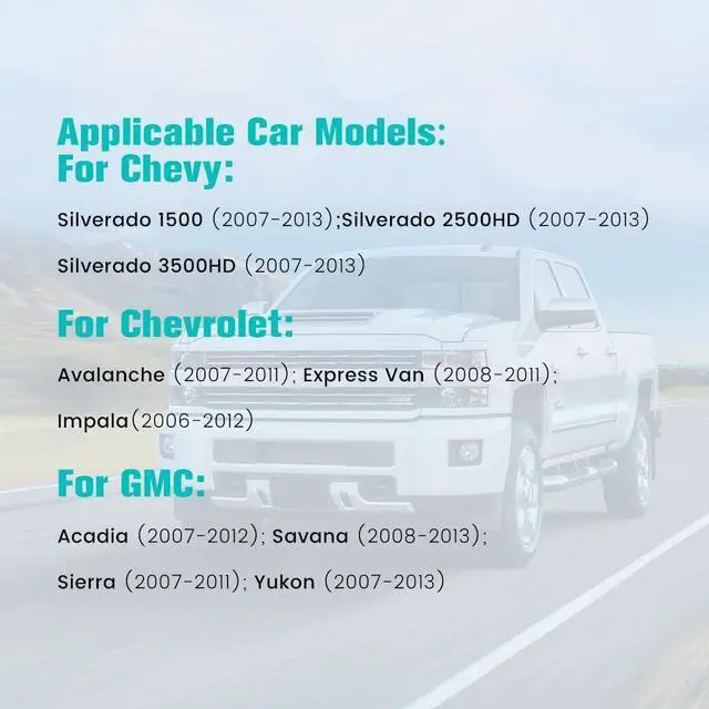Applicable Car ModelsFor Chevy Silverado 1500 (2007-2013); For Chevy Silverado 2500HD (2007-2013); For Chevy Silverado 3500HD (2007-2013); For Chevrolet Avalanche (2007-2011); For Chevrolet Express Van (2008-2011); For Chevrolet Impala(2006-2012); For GMC Acadia (2007-2012); For GMC Savana (2008-2013); For GMC Sierra (2007-2011); For GMC Yukon (2007-2013). ^^ FM Radio & BluetoothBuilt-in FM Radio listen to real-time traffic, news broadcasts, weather forecasts. Enjoy smart and safe driving. Built-in bluetooth offers faster transfer speeds. Quickly pair it with your smartphone, support phonebook synchronization, hands-free calls and play music.