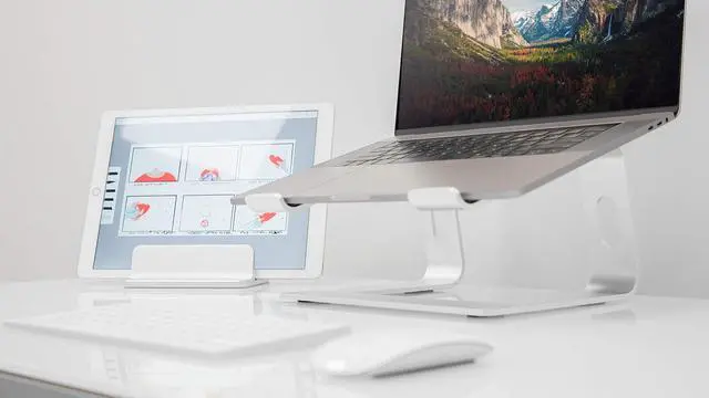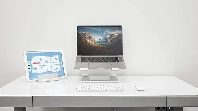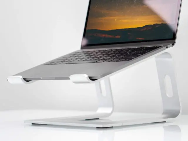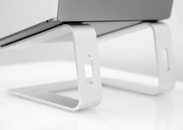 Laptop stand is collapsible into 3 pieces in seconds; for effortless travel and a quick commute to the office, to class, or just to the living room! ^^ Anodized aluminum matches Apple Macbooks ^^ Ergonomic structure supports improved reading posture ^^ Slip-free silicone matting holds your laptop in place ^^ Reduce clutter on your desk by storing your keyboard, phone and more conveniently under the stand (while upright)