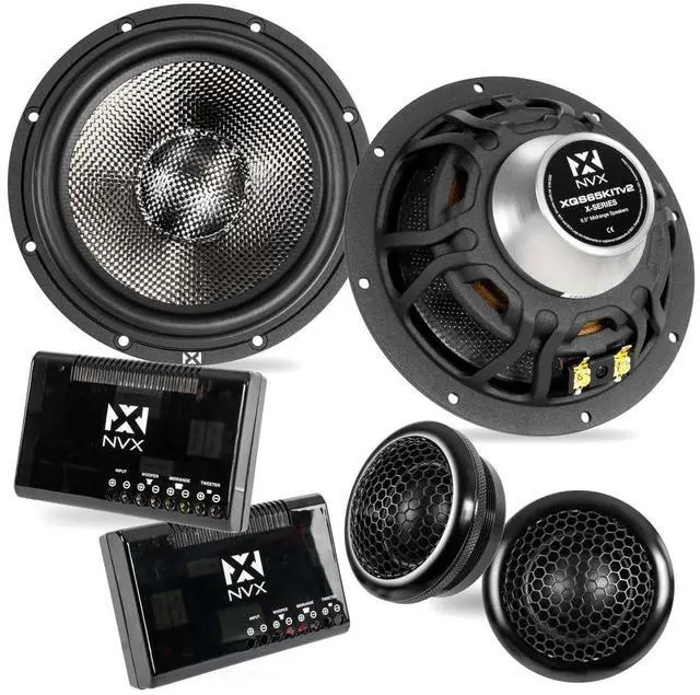 Premium 6.5" 2-Way Component Speaker System Designed for high-output, detailed sound with strong midbass and smooth high frequencies for car audio upgrades ^^ Carbon Fiber Cone Midwoofers Lightweight and rigid cones provide improved transient response, reduced distortion, and long-term durability ^^ 30mm Silk Dome Tweeters Neodymium-powered silk dome tweeters deliver smooth, natural high-frequency response without harshness ^^ Advanced External Crossover Networks Switchable 2-way or 3-way operation with adjustable tweeter and midrange attenuation for system tuning flexibility ^^ High Power Handling and Efficiency Rated at 600W peak (300W RMS per set), 93 dB sensitivity, 4-ohm impedance, and CEA-2031 compliant for reliable performance
