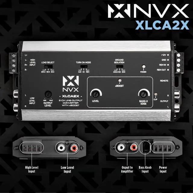 2-Channel Line Out Converter with Adjustable xBOOST corrects for bass roll-off ^^ Handles up to 30V (225 watts RMS) and Provides up to 9.5 Volts of output ^^ Auto turn-on via DC offset or Audio detection ^^ Load selection switch (20, 60, or 20K ohms) to prevent factory radio shut-down ^^ Wired remote bass level control included