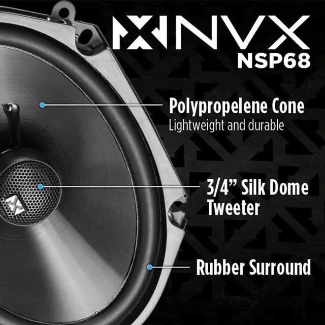 6" x 8" coaxial car speaker size with 20mm silk dome tweeter delivers warm treble with remarkable clarity and definition ^^ Polypropylene cone material is strong, yet lightweight for accurate mid and low tone ^^ RMS power 80 watts per pair ^^ Peak power 160 watts per pair ^^ High Temperature KSV Voice Coil provides superior current distribution with effective heat dissipation ^^ Nitrile Butadiene Rubber Surround supports smooth, linear movement for optimal accuracy