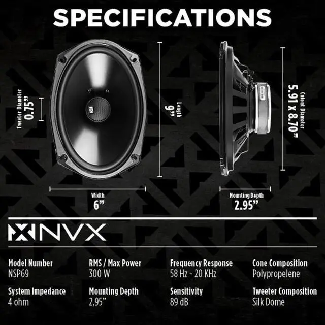 6" x 9" car speakers with 20mm silk dome tweeter delivers warm treble with remarkable clarity and definition ^^ Polypropylene cone material is strong, yet lightweight for accurate mid and low tone ^^ RMS power 110 watts per pair ^^ Peak power 220 watts per pair ^^ High Temperature KSV Voice Coil provides superior current distribution with effective heat dissipation ^^ Nitrile Butadiene Rubber Surround supports smooth, linear movement for optimal accuracy