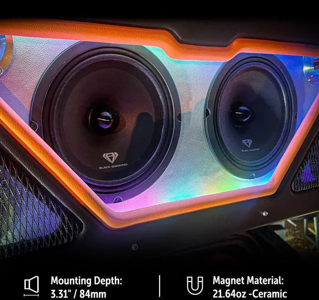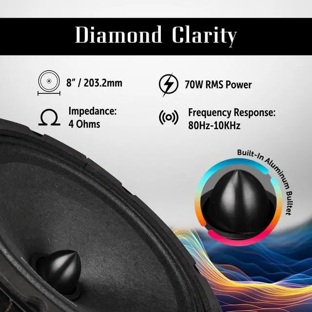 Black Diamond DIA-CM 8.4BT he Black Diamond series was designed to be the go to speaker for your high powered pro audio options. The DIA-CM 8.4B is a great all around pro audio midrange speaker with a huge frequency range. Playing as low as 80hz and screaming all the way up to 10khz this speaker will be sure to hit all the spine tingling notes you want to emphasize. The 21.6 oz magnet houses a 70w rms and 140w max 1.2 inch high strength voice coil for great heat dissipation and long lasting life. Integrated into the speaker itself is a high volume bullet resonator that gives this brute it's insane range.