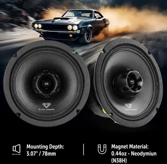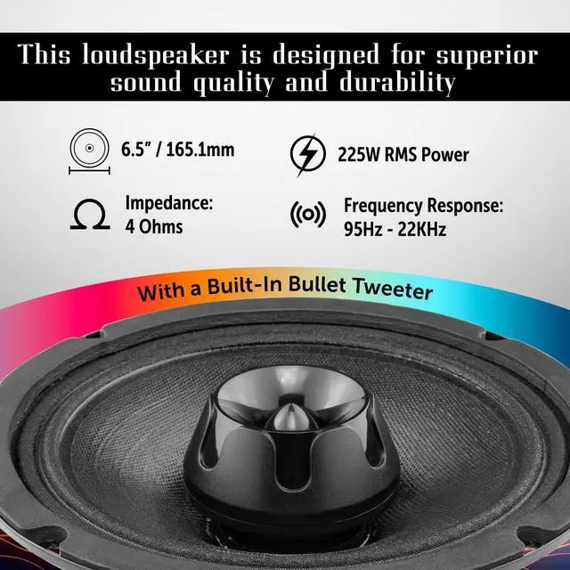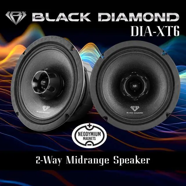 Powerful Performance - The DIA-XT6 delivers 225W RMS and 96dB sensitivity for loud, clear sound without overloading your system ^^ Precision Sound - Built-in bullet tweeter ensures sharp, detailed highs and full-bodied midrange for a balanced audio experience ^^ Durable Construction - Heavy-duty steel basket, 1.5 Kapton voice coil, and non-pressed paper cone for long-lasting performance ^^ Wide Frequency Response - Covers 95Hz to 22kHz, ideal for both front and rear door installations or multi-speaker setups ^^ Enhanced Magnet System - Ferrite and neodymium magnets for optimized audio performance, delivering every beat with clarity and depth