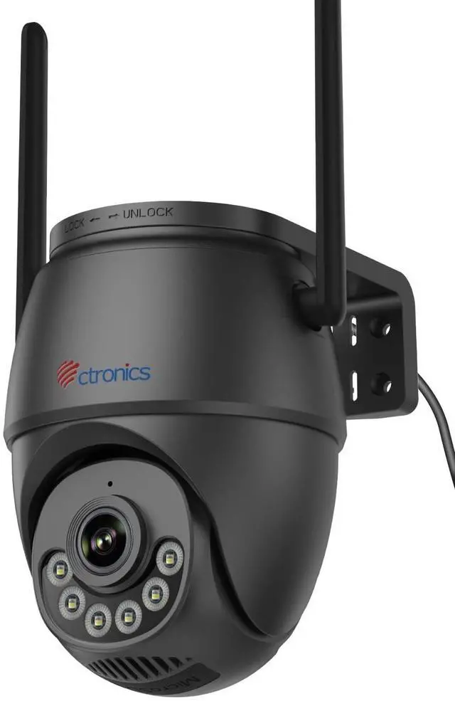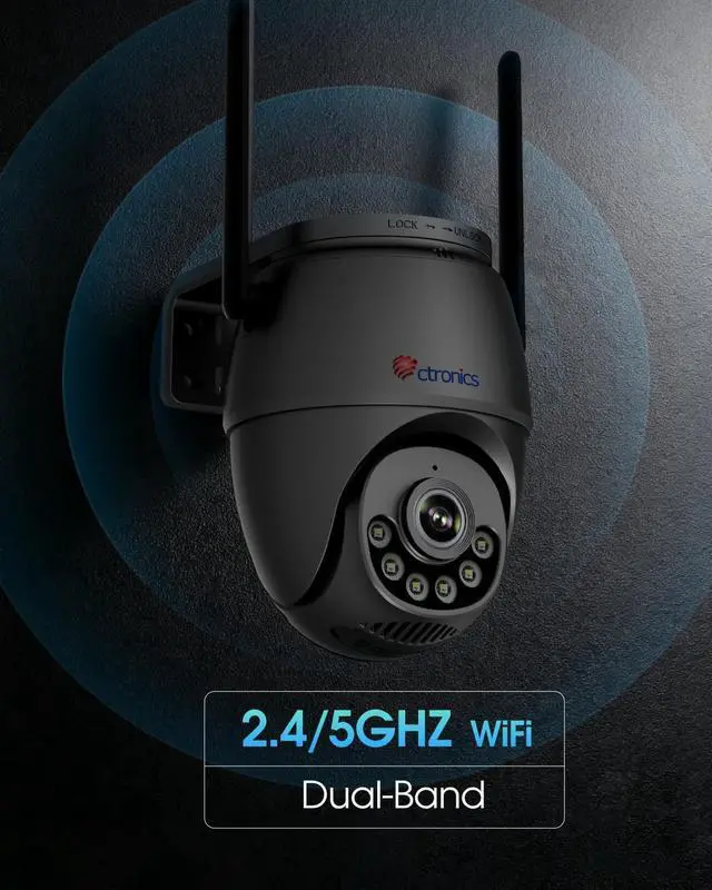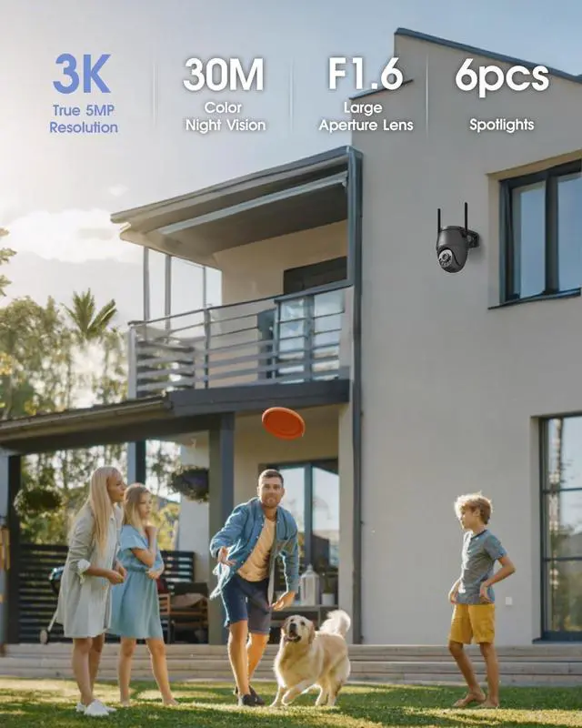 The Ctronics 5MP 3K HD smart security camera features AI detection for people, vehicles, and pets with automatic tracking to reduce false alarms. Equipped with 30m full-colour night vision, F 1.6 large aperture, and 3 spotlights for clear day and night images. Supports sound and light alarms with custom alert tones to effectively deter intruders. Dual-band WiFi enables flexible wall or ceiling mounting with a 180 adjustable top bracket. Compatible with PC and mobile app remote access, multi-user sharing, 128GB local storage, and 30-day cloud storage. Supports multiple protocols for versatile security solutions.