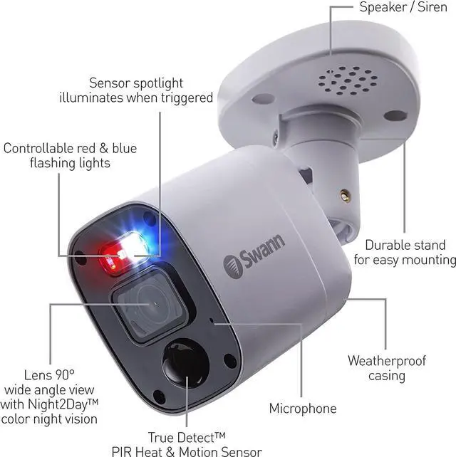 Works with DVR-5580RN and DVR-5680RN. DVR part number must have and RN on end of it for this to work ^^ 4K Bullet style Enforcer Camera with Microphone for recording audio (up to 16 feet away) ^^ Flashing Red and Blue Police Style lights to deter criminals and spotlight for color night vision ^^ True Detect PIR Thermal / Motion Detection and IP66 rated for outdoor use as well as indoor use ^^ Wide 90 degree viewing angle ^^