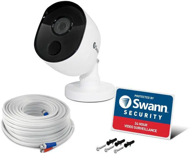 This 1080p Audio/Video Security Camera (camara de seguridad) features Swann's true detect PIR thermal sensing technology to reliably detect heat-generating moving objects, such as people, large pets and cars. With more accurate motion detection you have more reliable notifications and recording, eliminating false triggers such as falling leaves, bugs, rain and more, saving you hard drive space and playback time. Combine with a DVR to see and hear what's happening, thanks to the camera's powerful built-in microphone. The sturdy polycarbonate camera construction is weatherproof and can be used both outdoors and indoors.