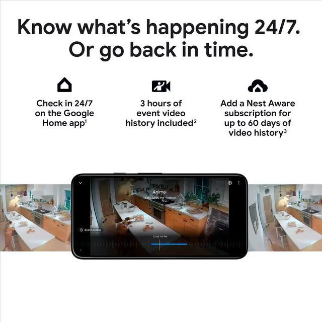[1]Some features, including mobile notifications, remote control, video streaming, and video recording, require working internet and Wi-Fi. [2]Up to 3 hours recording. Learn more at g. co/nest/3hours. [3]Nest Aware and Nest Aware Plus subscription sold separately. [4]Learn more at g. co/nest/cam-mem.