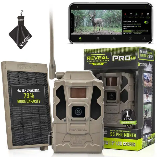 Includes Tactacam Reveal Pro 3.0 Trail Cameras, Tactacam Solar Panel and Field Boys Microfiber Cleaning Cloth by Trail Cams Galore, a Trademarked Brand.. The Tactacam Reveal Pro 3.0 is highly adaptable. It can be paired with optional accessories such as solar panels for extended battery life, and it is designed to work on multiple cellular networks, giving you flexibility in choosing your cellular provider. ^^ BUILT-IN-STORAGE - The Reveal Pro 3.0 Celluar Trail Camera now features an Optional SD Card Slot with Built-in-Storage, No SD Card is Required. ^^ QUICK, EASY SET UP - Setting up this game-changing camera is hassle-free, even for beginners.