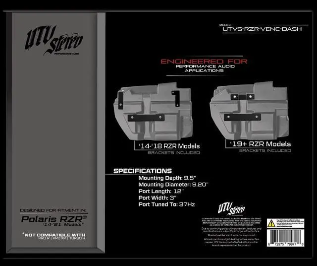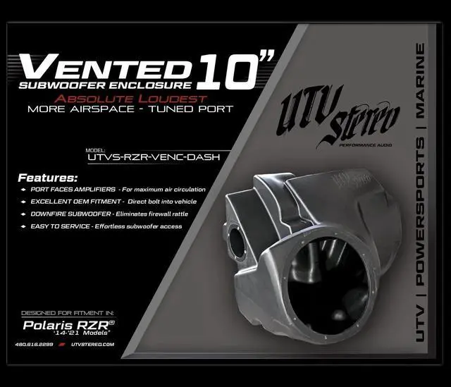 The biggest and baddest sub enclosure in the side by side industry. This vented sub enclosure hits harder than any other sub enclosure on the market. We would put this enclosure against ANY competitors box to play louder and hit a smoother cleaner deeper bass tone. Small sub enclosures make small output, but not with ours. The amount of engineering that was put into designing this box is well worth the sound quality it produces. We've designed this sub box to mount in the glove compartment of your RZR. Sub fires down to eliminate dash vibration, plus you can access sub woofer easily for service.