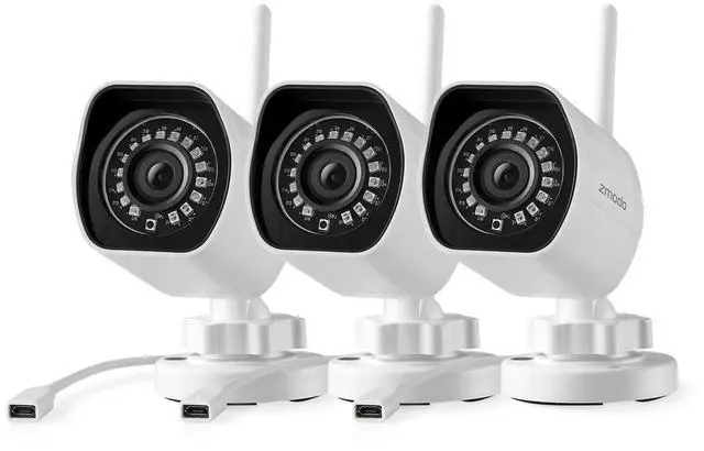 Zmodo Wireless Security Camera System Smart Home HD Indoor Outdoor WiFi IP Cameras with Night Vision (3 Pack) What's in the box 3) Zmodo Wireless Security Camera 1) Quick Guide 3) Power Adapter 1) Tools for Installation Setup Requirement Smartphone or tablet required iOS (v7 0 or up) or Android (v4 0 or up) Connectivity Requirement 2 4GHz WiFi network >2 Mbps upload speed for live view or >4 Mbps upload speed for cloud service