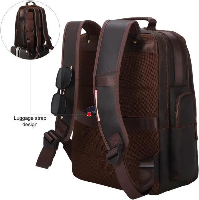 Material & Dimension: This large travel backpack is made of durable full grain cowhide leather and heavy duty ykk metal zipper. The new zipper is a little tight at first to extend its life and will become smoother over time. Dimensions: 13" L x 7.3" W x 17" H, weights 4.2lbs(a bit heavy and stiff due to 1.8mm thick leather). The length of adjustable shoulder strap: 21.6"-42.9".