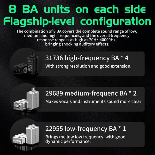 16BA High-Fidelity Sound,Flagship-level ConfigurationKZ AS16 HIFI earphone iem wired headphone earbuds equipped 8 BA units on each side,which is flagship-level configuration.The combination of 8 BA covers the complete sound range of low, medium and high frequencies, and the overall frequency response range is as high as 20Hz-40000Hz, bringing shocking auditory effects.31736 high-frequency BA * 4, with strong resolution and good extension. 29689 medium-frequency BA * 2, makes vocals and instruments sound more clear. 22955 low-frequency BA * 1, brings mellow low frequency, with good dynamic performance.