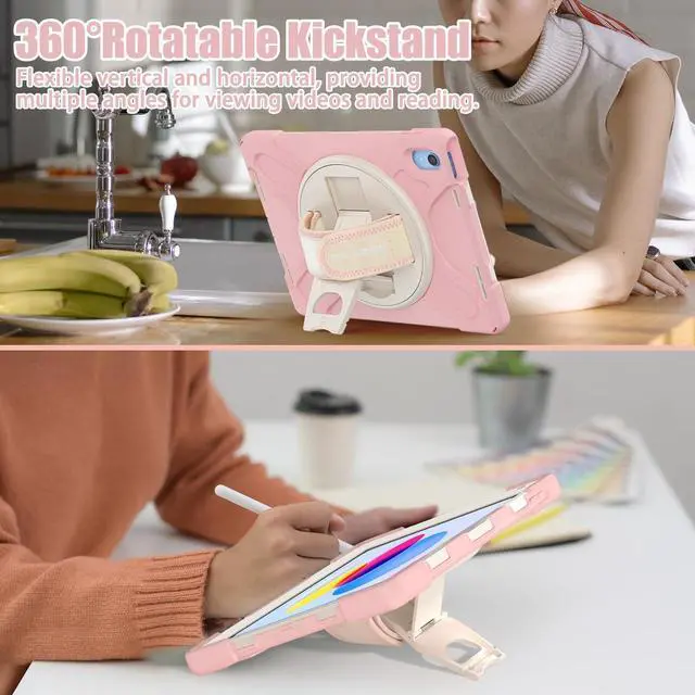 BRAECNstock Kids Case for Apple iPad (A16) 11th/10th Generation 11"/10.9" 20225/2022, Shockproof Protective Case with Screen Protector, Pencil Holder, Rotating Stand&Hand Strap, Sakura Pink