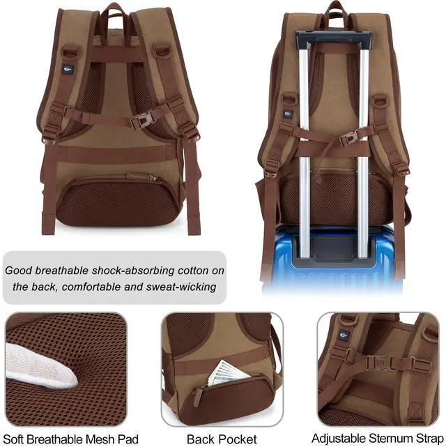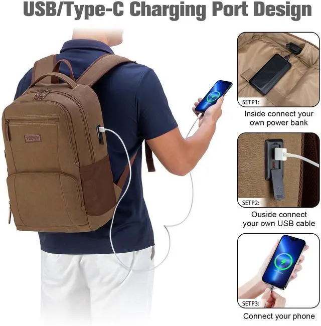 Tzowla Canvas Laptop College Backpack for Men and Women, Travel Work Vintage Rucksack with USB/Type-C Charging Port, Lightweight Hiking Casual Daypack Backpacks fit 15.6 inch Notebook, Brown