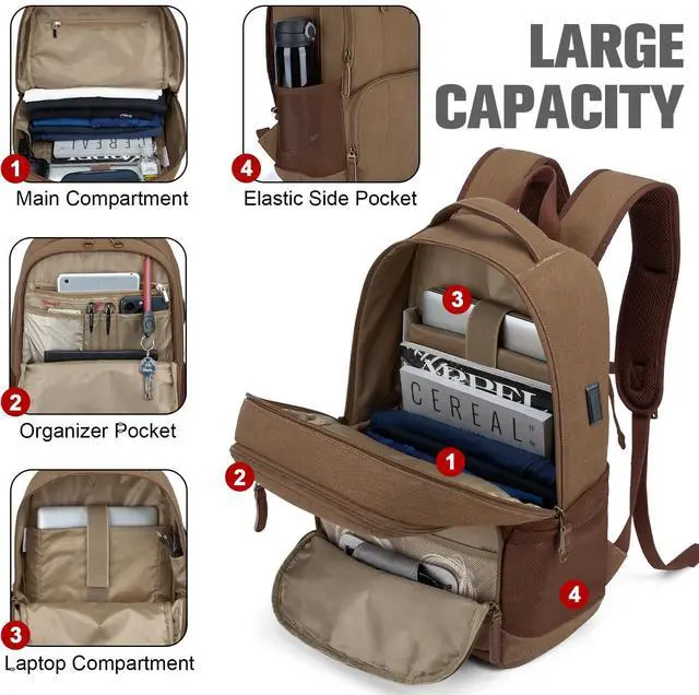 Large Capacity and Well OrganizedTzowla canvas backpack main pocket has one laptop compartment that can hold laptop up to 15.6 inch. It also storing any item like daily necessities, tech related items, accessories, wallet,mouth wash,deodorant and many more.There is an organizer pocket on the front of the backpack, which can be used to neatly store pens, keys, passports and other items. The side pockets can also be used to store water bottles and umbrellas.