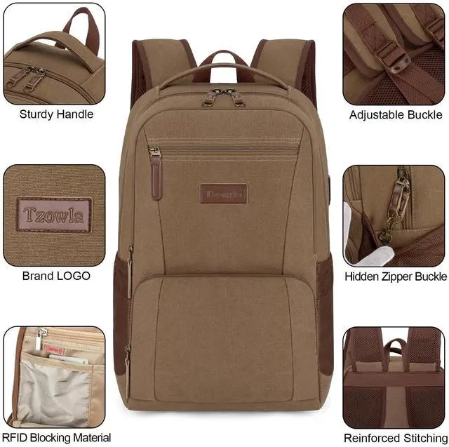 Tzowla Canvas Laptop College Backpack for Men and Women,Travel Work Vintage Rucksack with USB/Type-C Charging Port,Lightweight Hiking Casual Daypack Backpacks fit 15.6 inch Notebook,Brown