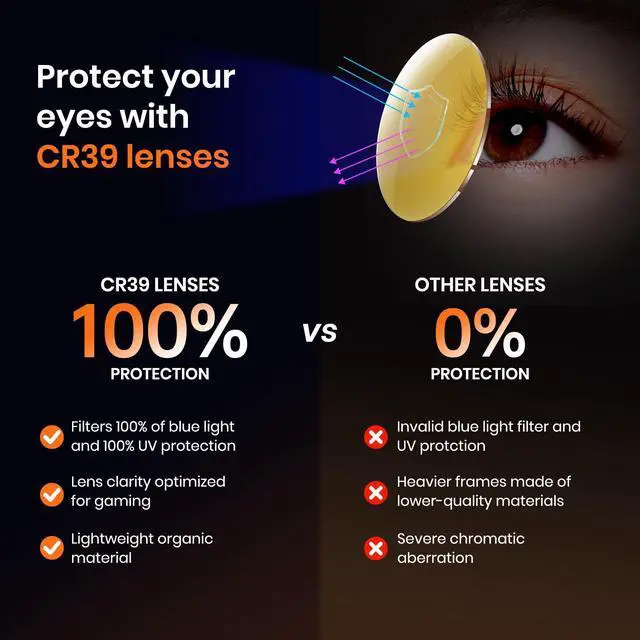 Advanced CR39 Lens Technology: Crafted from high-quality CR39 material, these lenses offer superior clarity and lightweight comfort. They efficiently filter out 99% of blue light, which is known to cause eye strain and disrupt sleep patterns, ensuring your eyes stay healthy and rested