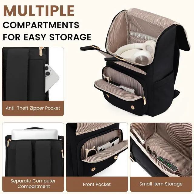 LOVEVOOK Travel Laptop Backpack for Women, 15.6 Inch Computer Backpack for School, Teacher Nurse Vintage Bookbag with U-Shaped Opening for Work College, Black