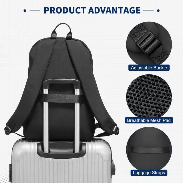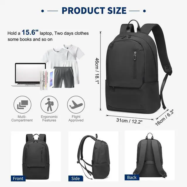 Multi Pocket Function -- The Laptop Backpack main compartment fits 15.6 inches laptop + 2-day essentials; Front quick-access pocket for passport and wallet; Dual side pockets with stretch mesh (holds 40oz bottles/umbrellas)